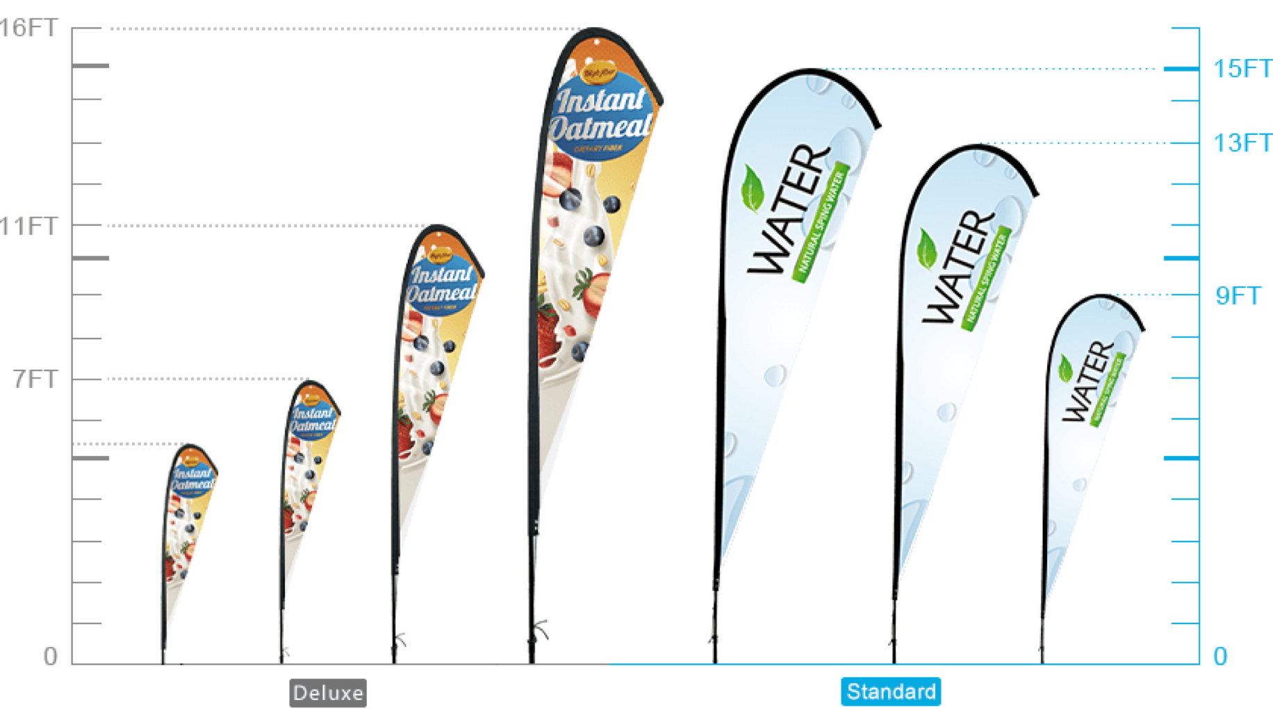 Advertising promotional flags range from 7ft, 9ft, 11ft, 13ft, 15ft, 16ft to custom sizes are available.